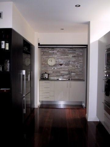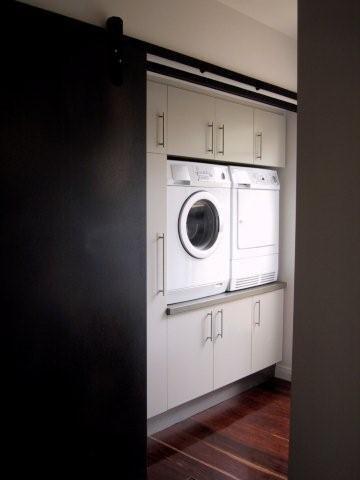 Though every home has one, your laundry does not need to be on display. This laundry at the end of the kitchen is housed behind a stylish sliding door so it can be closed off and the slider is discreet when visitors are present.